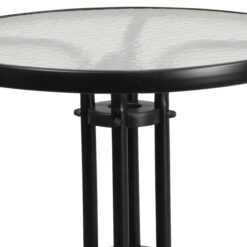 23.75RD Black Patio Table Set Whether you need to add more seating space or create an intimate conversation area, this versatile round tempered glass top table with 2 chairs is up to the task. Enhance the look of your bistro, cafe, restaurant, hotel or home patio space without taking up too much real estate. The ripple designed table top features a smooth surface for keeping items level. The lightweight chair features a curved slat style back to keep you comfortable. For easy storing and cleaning purposes these chairs stack up to 2 chairs high. A black powder coat finish lends this set a bold, versatile appearance. Cross braces provide extra stability when sitting and these sturdy chairs hold up to 352 lb. weight capacity. Designed for all-weather use, this set is a great option for indoor and outdoor settings. For longevity, care should be taken to protect from long periods of wet weather. Whether you are just starting your business or upgrading your furniture this seating group is a wise investment. [TLH-071RD-017CBK2-GG]