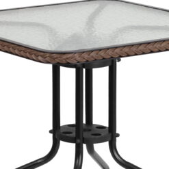Flash Furniture 28” Square Glass Metal Table with Dark Brown Rattan Edging and 2 Dark Brown Rattan Stack Chairs