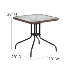 - Square Table: Top Size: 28″ Square, 5mm Thick Glass, 1.375″ Edge Top, Decorative Black Rattan Edge Band