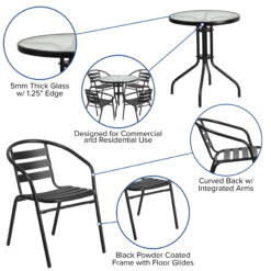 If you love hosting family and friends on your deck or need extra seating for the new dining patio of your cafe, this round table and 4 chair set is just what you need. The table’s rippled designer glass top has a smooth surface for keeping items level. The lightweight chair features a curved slat style back to keep you comfortable. Cross braces provide extra stability when sitting and these sturdy chairs hold up to 352 lb. weight capacity. For easy storing and cleaning purposes these chairs stack up to 4 high. This set was designed for all-weather use making it a great option for indoor and outdoor settings. For longevity, care should be taken to protect from long periods of wet weather. Whether you are just starting your business, expanding your “al fresco” seating or springing for the outdoor kitchen you’ve always wanted, this set will give you the perfect look.