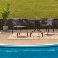 Flash Furniture Barker 28” Round Tempered Glass Metal Table with Gray Rattan Edging