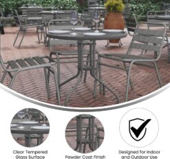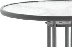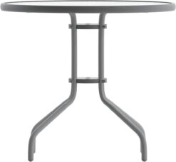 Whether you need to add more seating space or create an intimate conversation area, this versatile round tempered glass top table is up to the task. Enhance the look of your bistro, cafe, restaurant, hotel or home patio space without taking up too much real estate. The ripple designed table top features a smooth surface for keeping items level. A silver powder coat finish lends the round-shaped table a bold, versatile appearance that matches well with your favorite chairs. Designed for all-weather use, this table is a great option for indoor and outdoor settings. For longevity, care should be taken to protect from long periods of wet weather. Whether you are just starting your business or upgrading your furniture this table is a wise investment.