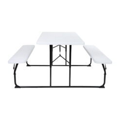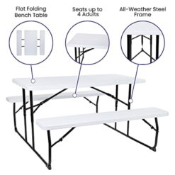 Make any day a picnic with this all-in-one foldable table and bench set. The collapsible picnic table folds flat to store during extreme wet weather. If you enjoy camping and need a full-size seating solution this portable folding picnic table can be used on the go.