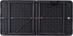 This durable, easy to clean table folds in half, making it easy to store and transport.