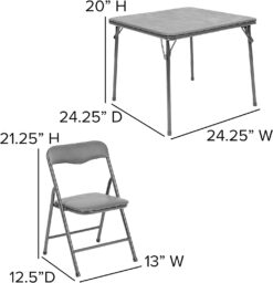 - PRODUCT MEASUREMENTS: Table Size: 24″W x 24″D x 20.25″H; Chair Size: 12.5″W x 13.5″D x 21.25″H; Seat Size: 10.5″W x 10.5″D x 12.25″H; Back Size: Back Size: 12.5″W x 10″H; Folded Chair Size: 13″W x 1.25″D x 21.25″H; No Assembly Required