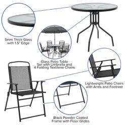 Flash Furniture Nantucket 6 Piece Black Patio Garden Set with Umbrella Table and Set of 4 Folding Chairs
