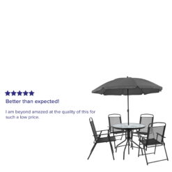 You can enjoy this set quickly, assembly of the table goes up in minutes and the chairs come fully assembled. The folding chairs are upholstered in a durable, breathable textilene material, designed for all-weather use. The attractive rippled tempered glass sits atop a 4-legged metal framed base. The included umbrella will shade you on those sunny days and has a tilt function that is activated by pushing the plastic ring on the pole. For longevity, care should be taken to protect from long periods of wet weather. Clean with a water based cleaning solution to keep in pristine condition.