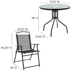 - Glass Patio Table: 31.25″W x 31.25″D x 28″H; Base Size: 17.75″W x 19″L