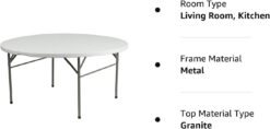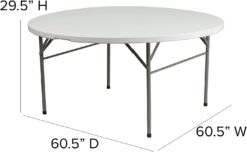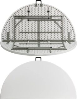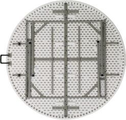 - Hosting just got much easier with ready to use this bi-fold 5′ round plastic folding table that seats up to 6 people. Attached carrying handle makes it easy to transport while the legs fold under for storage.