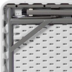 The table legs fold under the table to make storage more convenient and for better portability.