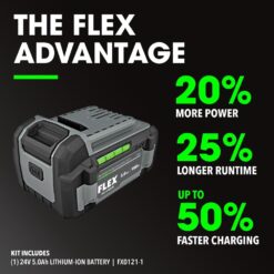 - THE FLEX ADVANTAGE – 20% more power with 24V lithium, 25% longer runtime with THERMA-TECH heat management, up to 50% faster charging with high-power, dual fan chargers