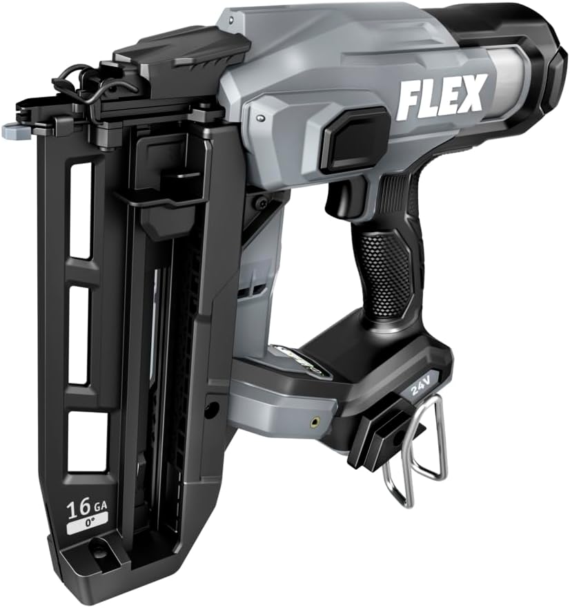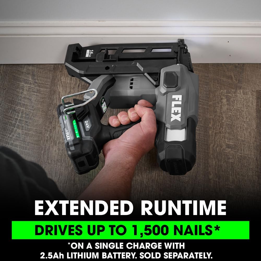 Power through moulding and trim installation with the FLEX 24V Brushless 16Ga Straight Finish Nailer. This cordless finish nailer delivers high-speed power by driving up to 3 nails per second with zero ramp up time. It drives up to 1,500 nails on a single charge with a 2.5Ah lithium-ion battery (sold separately) for extended runtime. The nail gun features an ergonomic quick depth adjustment lever to easily set the ideal nailing depth when driving fasteners, and its triple LED light delivers shadow-free illumination for better visibility in dark work areas. The cordless nail gun toggles between bump and sequential firing modes and has a nail indicator to easily see how many nails remain in the magazine. Dry-fire lockout avoids blank firing and damage to your work when the nail supply is exhausted. Tool-free jam clearance allows you to quickly clear jammed nails without tools for maximum efficiency when you’re on the job. The cordless nailer is compact and lightweight to conquer tight spaces with minimal fatigue. Its heavy-duty belt clip can be mounted on either side of the tool and features a lead-in profile. The finish nailer accepts 3/4-inch to 2-1/2-inch 16-gauge fasteners. This cordless nailer delivers the FLEX Advantage of unmatched battery power, runtime, and fast charging (batteries and chargers sold separately). It’s all protected by the FLEX Limited Lifetime Warranty when registered within 30 days of purchase at registermyFLEX.com through December 31, 2024.