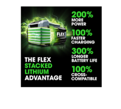 - THE FLEX STACKED LITHIUM ADVANTAGE – 200% more power with 24V Stacked Lithium, 300% longer battery life with THERMA-TECH™+ heat management, 100% faster charging, 100% cross-compatible with all FLEX 24V tools and chargers