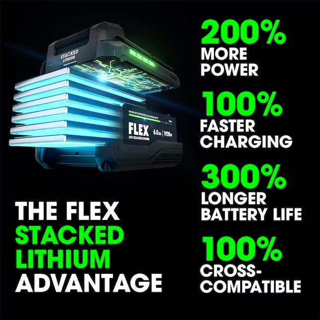 - THE FLEX ADVANTAGE – 20% more power with 24V lithium, 25% longer runtime with THERMA-TECH™ heat management, up to 50% faster charging with high-power, dual fan chargers (battery and charger sold separately)