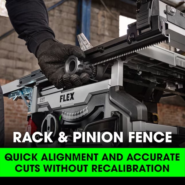 Dominate long cuts and rip plywood and OSB sheets with the FLEX 24V 8-1/4” Table Saw. This cordless table saw delivers best-in-class rip capacity with its folding side extension table for 20.5-inch blade left clearance and 25-inch blade right clearance, perfect for large sheets of plywood and OSB. Its rack & pinion fence system allows quick alignment and accurate cuts. A rechargeable LED fence worklight lights up your workpiece and is removable for added lighting versatility around the jobsite. A battery power indicator displays the battery capacity on the front panel of the saw for quick and easy charge status checks. The portable table saw is compatible with the FLEX 24V Power Adapter (FX0511, sold separately) to unlock all-day AC power for extended cutting sessions. This cordless table saw delivers the FLEX Advantage of unmatched battery power, runtime, and fast charging (battery and charger sold separately). The table saw includes the table saw, rechargeable LED fence light, miter gauge, push stick, 8-1/4-inch 24T blade, non-through cut riving knife, modular guard system, anti-kickback pawls, and blade change wrench. It’s all protected by the FLEX Limited Lifetime Warranty when registered within 30 days of purchase at registermyFLEX.com through December 31, 2024.