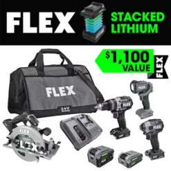 Show up to the jobsite in full force with four FLEX 24V essentials. This kit combines the powerful cutting capabilities of the FLEX 7-1/4″ Circular Saw with the torqued-out FLEX 1/2″ 2-Speed Hammer Drill and FLEX 1/4″ Hex Impact Driver. Plus, do it all while commanding ultimate jobsite visibility with the FLEX Work Light. Total FLEX 24V cross-compatibility also means these tools share the FLEX Stacked Lithium Advantage of unmatched 24V battery power, runtime, and charging capability. Kit includes all four tools, two 24V batteries, and charger. Protected by the FLEX Limited Lifetime Warranty when registered within 30 days of purchase at registermyFLEX.com through December 31, 2024.
