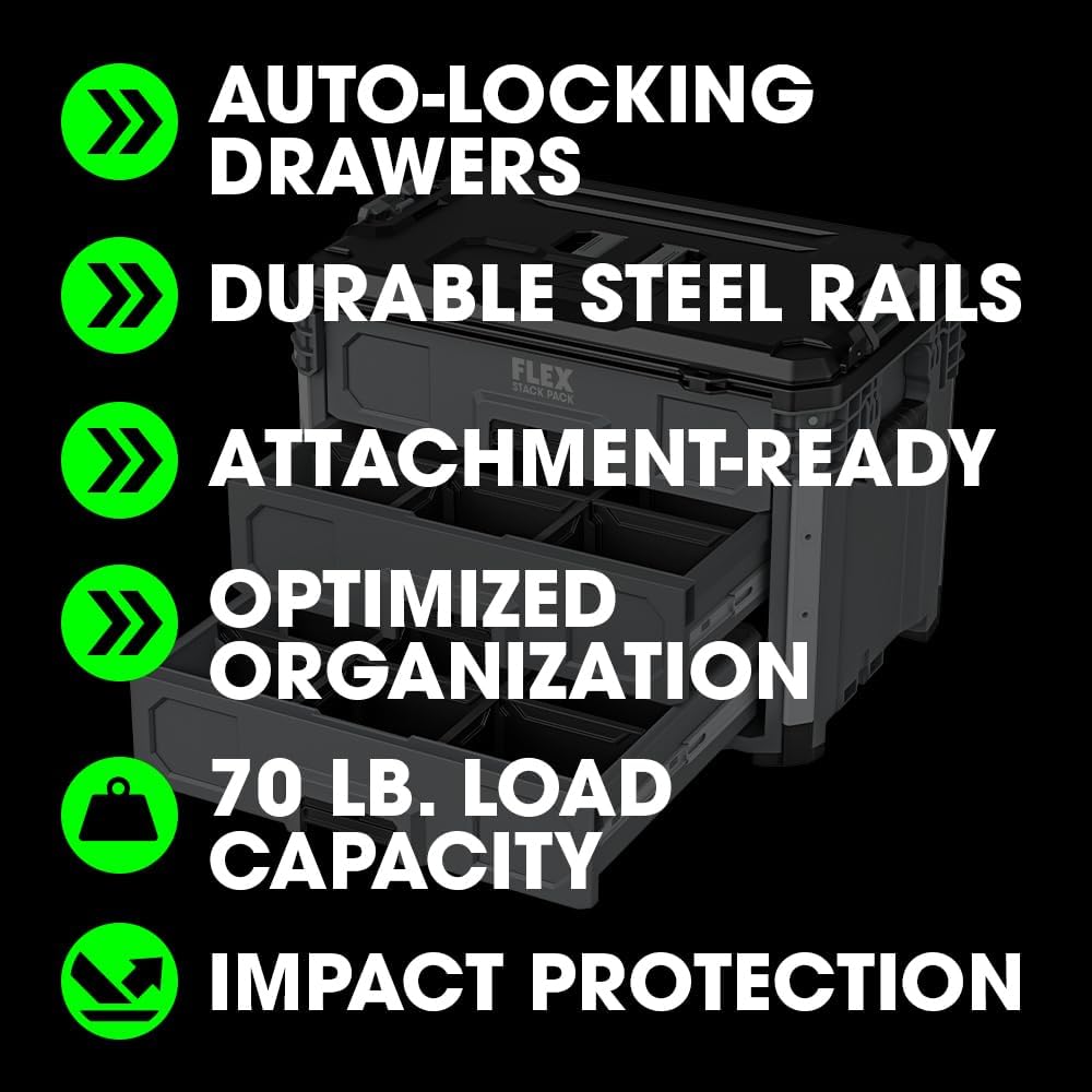 Keep your trailer, garage, or workshop organized with the FLEX STACK PACK™ 3-Drawer Tool Box. This three-drawer toolbox features auto-locking mechanisms that securely close and prevent drawers from opening during transport while durable rust-resistant rails ensure the drawers open and close smoothly over a long life. The drawers are optimized for compact tools like impact wrenches and reciprocating saws and come with removable dividers in each drawer so you can organize a variety of hardware or supplies. Quick-connect latches offer fast and effortless connectivity so you can quickly stack and unstack toolboxes for a fully customized STACK PACK™ configuration. An onboard security bar allows you to lock the drawers to prevent theft and stows between use. It’s protected by a one-year limited warranty when registered within 30 days of purchase at registermyflex.com.