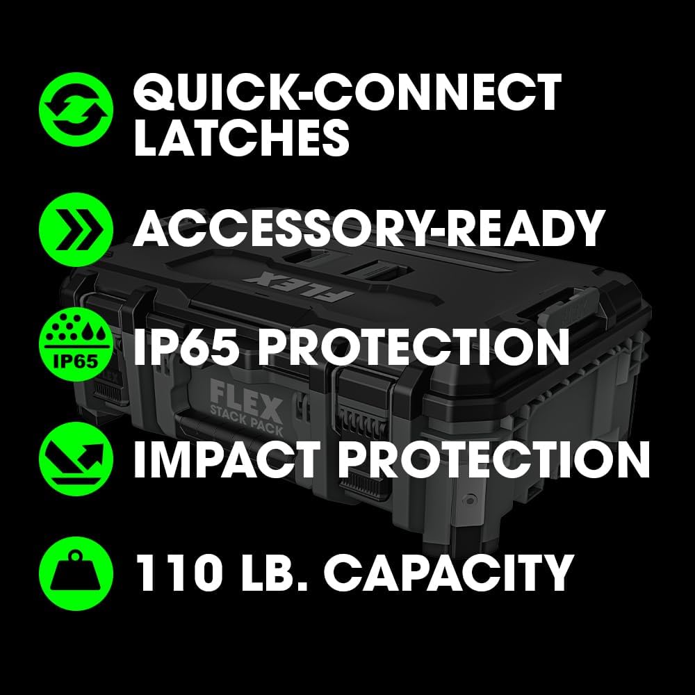 Pack everything you need for a day on the job with the FLEX STACK PACK™ Suitcase Tool Box. IP65 all-weather protection shields your tools and accessories from the elements, and an impact-resistant polypropylene body with aluminum reinforced corners offers protection from the toughest jobsite conditions. Quick-connect interlocking attachment points offer fast and effortless connectivity with any piece in the STACK PACK™ storage system so you can custom build your layout for the ultimate traveling workshop.Protected by a one-year limited warranty when registered within 30 days of purchase at registermyFLEX.com.