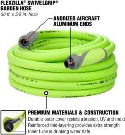 Flexzilla Garden Hose with SwivelGrip, 5/8 in. x 50 ft., Heavy Duty, Lightweight, Drinking Water Safe, ZillaGreen – HFZG550YWS-E
