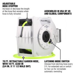 - Latching mode switch – choose from latching hose every 3 ft. for extended use or switch to free run for immediate automatic rewinding