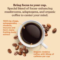 - MUSHROOMS THAT ARE TRULY MAGIC — Our Focus Organic Coffee boasts the benefits of heightened focus and creativity from 500mg of Lion’s Mane, along with immune-boosting antioxidants from 500mg of Chaga. These must-have functional mushroom powerhouses boost and heighten focus, immune support, antioxidants, and more.