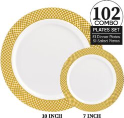 FOCUSLINE 102Pcs Disposable Plastic Plates Gold Grid Rim Party Plates, 51Pcs 10 Inch Dinner Plates and 51Pcs 7 Inch Dessert Plates Elegant Fancy Heavy Duty Wedding Plates