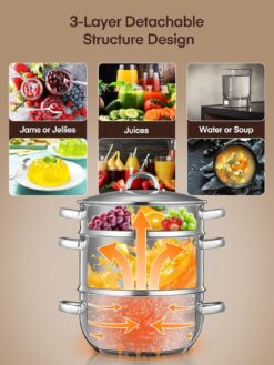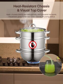 - High-Quality Stainless Steel Material- The stainless steel juice steamer is made of durable food-grade stainless steel, clean, hygienic material; Each layer has a sturdy side handle for easy access; The handle on the lid is curved, which is convenient for wearing gloves to easily open the lid when collecting juice, protecting your hands from burns;