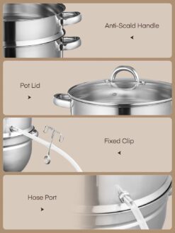 - Multi-purpose- Add water to the bottom of the stainless steel steam juicer, add fresh fruits to the top layer, and steam the juice with the stove. It can be used to make jelly, fructose, etc. In addition, after the juice steamer is disassembled from the hose, it can be used as an ordinary steamer, such as stewing soup, boiling water, steaming, etc., to meet your various cooking needs and retain the nutrition of food;