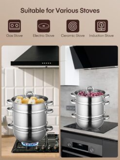 - Strong Compatibility- FOHERE fruit juicer steamer is compatible with various stoves, including induction cookers, gas stoves, electric ovens, etc; The bottom layered chassis quickly and evenly dissipates heat, and the outer wall does not have any scorched discoloration, which effectively prevents hot spots; The stackable storage design saves you kitchen space;