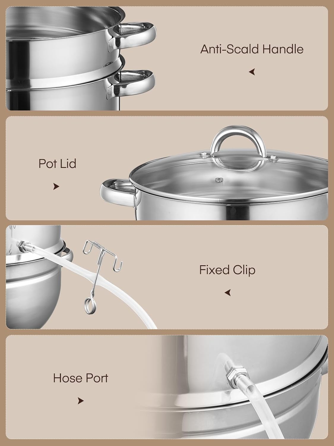 - High-Quality Stainless Steel Material- The stainless steel juice steamer is made of durable food-grade stainless steel, clean, hygienic material; Each layer has a sturdy side handle for easy access; The handle on the lid is curved, which is convenient for wearing gloves to easily open the lid when collecting juice, protecting your hands from burns;