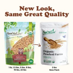 Food to Live Organic Italian Pearled Farro, 5 Pounds – Non-GMO, Kosher, Vegan, Whole Farro Grain in Bulk, Good Source of Fiber and Protein, Free of Sodium and Sugar