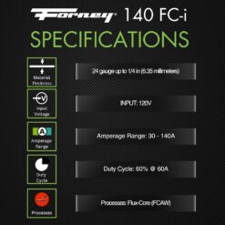 The Forney Easy Weld 140 FC-i is a powerful flux-core wire welder. This machine is ideal for do-it-yourselfers (DIY), maintenance, repair, metal fabrication, and hobbyists. Like the other Forney Easy Weld machines, this welder is extremely lightweight (weighing in at only 19 pounds!) and portable. This unit is easy to use and features infinite voltage and wire feed speed control. The Forney Easy Weld 140 FC-i is incredibly convenient, as it does not require gas and can run off standard household power as long as you have at least a 20 AMP breaker.