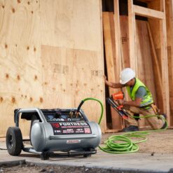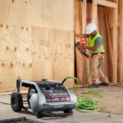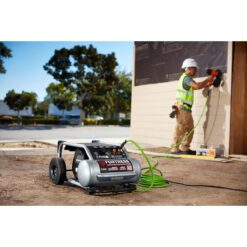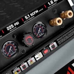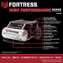 This FORTRESS® 225 PSI Oil-Free Professional Air Compressor uses High Pressure Technology to deliver the same runtime benefits as a 19 gallon/125 PSI tank. The compressor has an integrated control panel with easy-to-read gauges and two built-in quick connect couplers for easy one-handed hose connection.