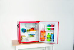 The Frigidaire 1.6 cu. ft. red retro design refrigerator with built-in side bottle opener has enough room to store your favorite foods and drinks, while not taking up a lot of space. The convenient door basket on the reversible door is large enough for two-liter bottles and canned drinks. Opening bottles is a breeze with this built-in side bottle opener. No more fumbling through crowded drawers hunting for your bottle opener. This low energy consumption refrigerator is perfect for the office or extra rooms away from the kitchen with its space saving flush back design.