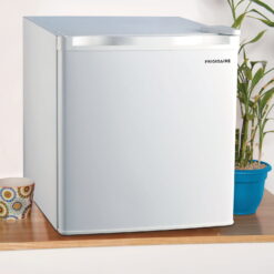 The Frigidaire 1.6 cu-ft. Mini White Fridge is roomy enough for your groceries but small and sleek enough to fit almost anywhere. The convenient door basket on the reversible door is large enough for 2L bottles, canned drinks and other items. The door can be conveniently set to open from the left or right side to fit your needs. It is ideal for a college dorm, bedroom, office or any place you need a compact fridge to keep your food and beverages handy and cold. This reversible door refrigerator has an ice cube tray, adjustable thermostat, and an invisible door handle. With its space-saving design you can safely and conveniently place this Frigidaire 1.6-cu.-ft. Refrigerator in any spot.