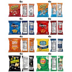 - Includes (8) 1 oz bags of Doritos Nacho Cheese, (6) 1 oz bags of Doritos Cool Ranch, (4) 1 oz bags of Lay’s Sour Cream & Onion, (4) 1 oz bags of Rold Gold Tiny Twists, (4) 0.625 oz bags of Smartfood White Cheddar Popcorn, (6) 1 oz bags of Cheetos Crunchy, (4) 0.875 oz bags of Cheetos Puffs, and (4) 1 oz bags of Sunchips Harvest Cheddar