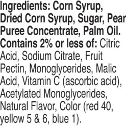 Corn Syrup, Sugar, Pear Puree, Maltodextrin, Palm and/or Palm Kernel Oil. Contains 2% or less of: Citric Acid, Sodium Citrate, Monoglycerides, Fruit Pectin, Malic Acid, Vitamin C (ascorbic acid), Natural Flavor, Color (red 40, yellows 5 & 6, blue 1).