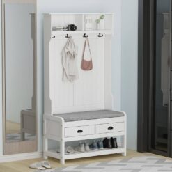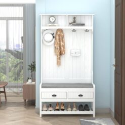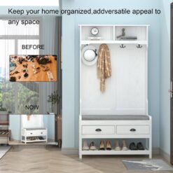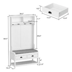 The functional and stylish hall tree with storage bench and coat rack is the perfect focal point for your entryway. The hall tree and bench is visually appealing with its white finish to brighten up your space, while providing the necessary to storage to keep your entrance clutter-free. With four metal hooks and a roomy storage bench for sitting, it is the perfect addition for any entryway hallway garage or laundry room space.Pull the drop-down drawers forward with genuine metal hardware and find two spacious cubbies inside, perfect for storing shoes, scarves, and other clutter best kept out of sight. The tall, slatted back is equipped with hooks for hanging coats out of the way, and two more overhead cubbies offer space for decor or storage.