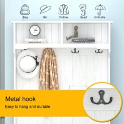 - Crafted from MDF wood, its hutch offers 2 cubbies and 4 hooks, perfect for tucking away coats, hats, gloves, and other outdoor wear, while lend you a seat to pull on your boots