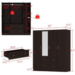 FUFU&GAGA KF330062-034 Brown Wood Grain 63 in. W 4-Door Big Armoires With Mirror, 2 Hanging Rods, 2 Drawers, Storage Shelves (70.9 in. H)