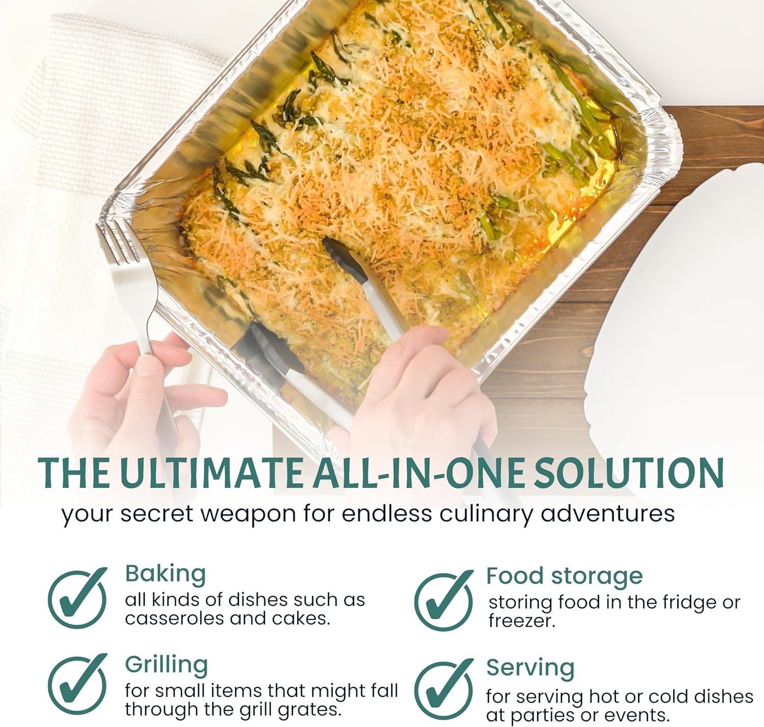 - 𝗨𝗽𝗴𝗿𝗮𝗱𝗲 𝗬𝗼𝘂𝗿 𝗖𝗼𝗼𝗸𝗶𝗻𝗴 𝗚𝗮𝗺𝗲 – With our lightweight and durable tin foil baking pans and disposable pans made of premium quality thick aluminum foil with high side walls, ensuring a mess-free and enjoyable cooking experience every time!