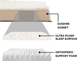 - Orthopedic pet bed is topped with silky-soft faux fur and lustrous suedine gusset.