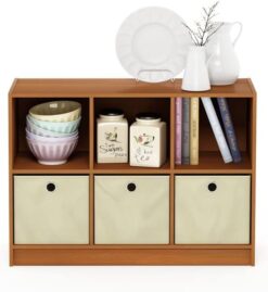 Furinno Basic 3×2 Bookcase Storage w/Bins, Light Cherry/Ivory