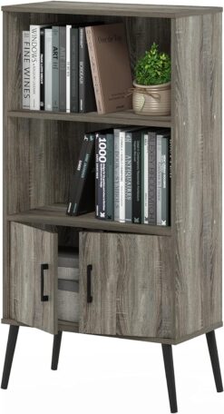 Furinno Claude Mid Century Style Accent Wooden Leg Bookcase Cabinet with Storage Organizer Shelves, French Oak Grey