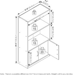 - Features 2 open shelves and 1 closed cabinet to keep your space tidy. Each shelf is able to hold up a weight capacity of 15 pounds; the bottom shelf holds up to 20 pounds.