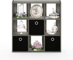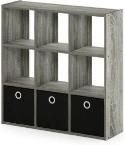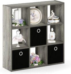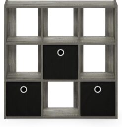 Furinno Simplistic 9-Cube Organizer with Bins, Small Size (Assembled unit dimensions : 7.9″D x 26.5″W x 26.7″H inches), French Oak/Black