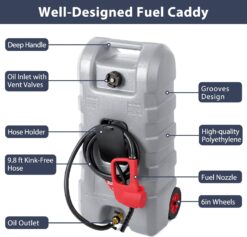 - 【Easy to Carry & Transport】The fuel can comes with two sturdy 6-inch wheels and a molded top handle making it a breeze to maneuver the tank over rough terrain and easily transport it from dock to small fishing boats, dinghies, and other small vessels. Pick it up with the top handle and take it anywhere.