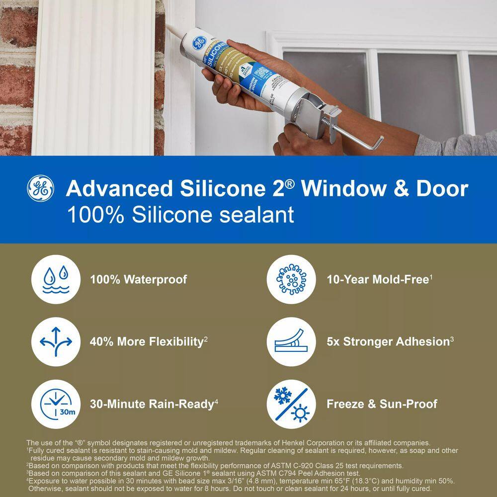 GE Advanced Silicone 2 Window and Door sealant is a high-performance, 100% weatherproof and 100% silicone caulking ideal for protecting areas susceptible to harsh weather. Used for exterior applications, the caulk is rain-ready in 30 minutes and offers 10-year product protection against mold and mildew growth. Our sealant is 40% more flexible than Class 25 sealants and has 5X stronger adhesion than our Silicone 1 sealant. This caulk also has a low odor thanks to its neutral-cure formula, and it won’t discolor most high-end metal finishes such as chrome, bronze, and nickel. Use GE Advanced Silicone 2 Window and Door caulk on a variety of surfaces, including windows, doors, siding, trim, molding, baseboards, vents, basements, attics, and around wires and pipes.