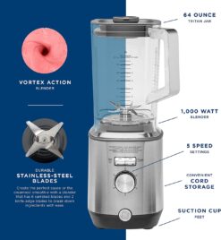 - 1000-Watt Blender – this versatile and powerful 1000-watt blender delivers the performance you need for blending essentials like crushing ice, pureeing frozen fruit, or blending sauces, soups and frappe drinks