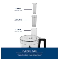 - Large Inner Feed Tube – a large inner feed tube with stackable tubes gives you three openings to accommodate whole or large ingredients, as well as smaller foods and liquids